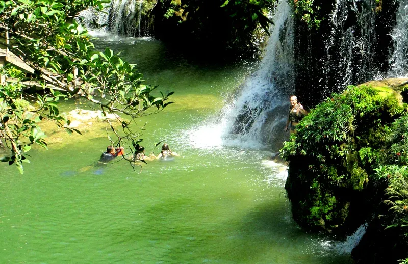 Inclui caminhada de três horas por uma trilha que tem mirantes com vistas panorâmicas da Serra da Bodoquena. No caminho, paradas para mergulhos e banhos em um conjunto de dez cachoeiras e piscinas naturais. Há, também, exploração de grutas, observação de animais, um lago com jacarés, plataforma de saltos, passarelas suspensas, cavalgada e trecho percorrido em barco a remo. O local oferece almoço típico da fazenda com pratos preparados no fogão a lenha.