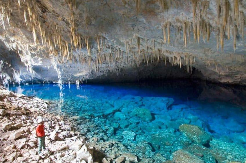Um buraco com 72 metros de profundidade e iluminado apenas por fendas entre as rochas guarda um imenso lago de águas cristalinas. O Abismo Anhumas é bastante procurado para a prática de rapel, flutuação e mergulho. Lá embaixo há um deck flutuante paira sobre um espelho de águas cristalinas de um lago com 80 metros de profundidade. O acesso à Gruta Anhumas é feito apenas através de rapel, que leva até a caverna que abriga o lago do tamanho de um campo de futebol.