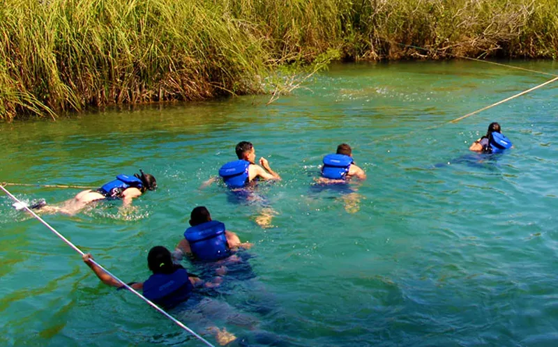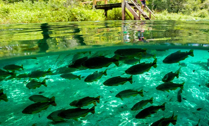 Ideal para aqueles que querem experimentar a sensação de mergulhar com equipamento scuba em meio aos cardumes de peixes no Rio Formoso. O cenário aquático tem troncos submersos e formações calcárias, além de passar por baixo de uma cachoeira.
