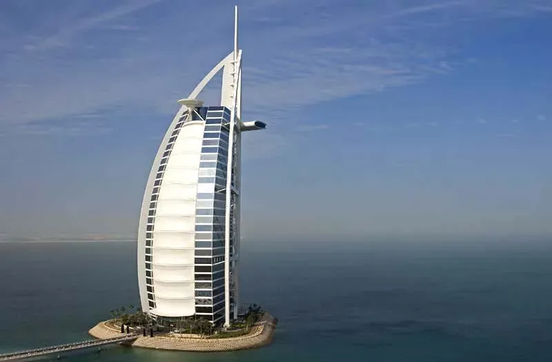 Primeira imagem associada ao gigantismo de Dubai foi o Burj Al Arab, um dos mais caros hotéis do planeta. Sua arquitetura lembra uma grande e moderna caravela. O edifício de 321 metros de altura foi projetado para fazer dos hospedes verdadeiros sultões. É considerado um hotel categoria 7 estrelas.