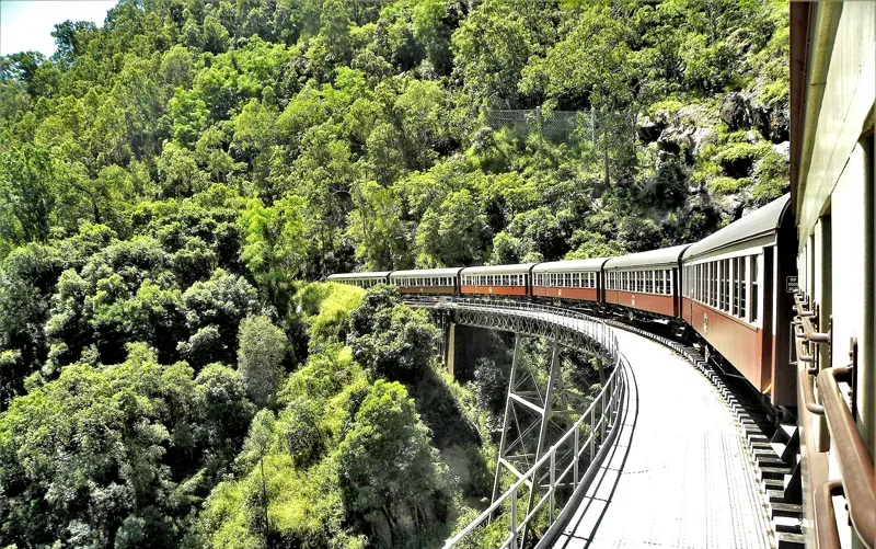 Cairns tem atrativos como o teleférico até Kuranda e o passeio de trem pela Kuranda Scenic Railway, uma ferrovia que corta uma floresta tropical considerada uma das mais antigas do planeta. Repleta de cachoeiras ela abriga uma incrível variedade de plantas e animais.