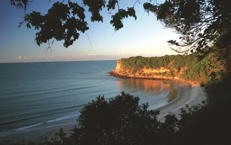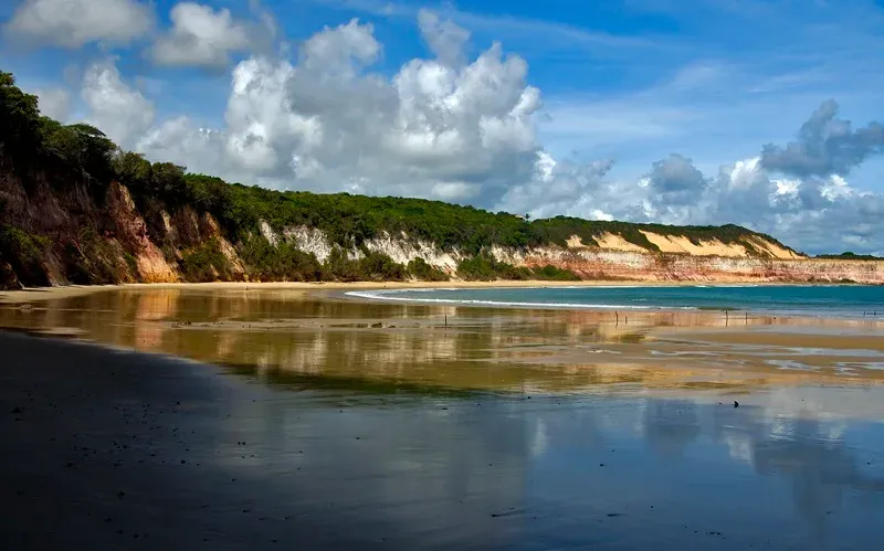 O visual é lindo e se der sorte de ver os golfinhos brincando no mar o dia estará ganho. Uma enorme falésia avermelhada protege a praia que é acessada somente pela faixa de areia e durante a maré baixa. Mas, atenção, cuide de voltar antes da maré começar a subir.