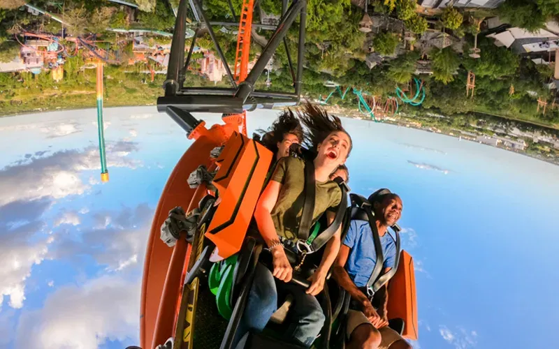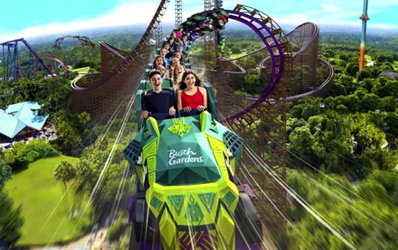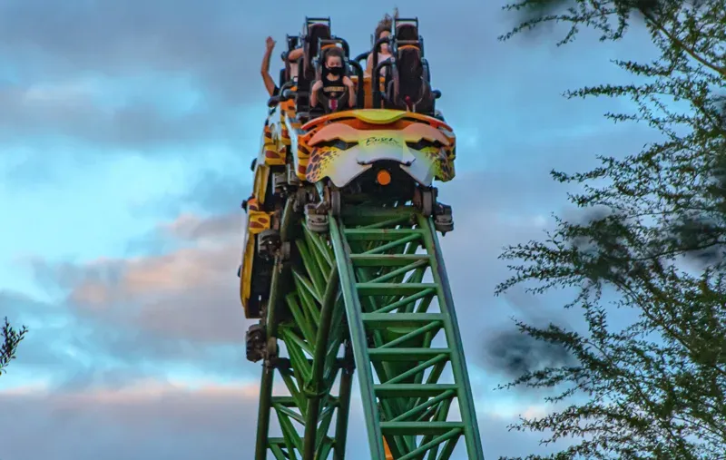 Na Falcon’s Fury os visitantes testam seus limites quando os assentos viram 90° para o chão, em direção a uma queda de 90 metros a mais de 100 km/h. Do alto da atração inspirada no sobrevoo do falcão é possível visualizar todo o parque e até o centro de Tampa Bay. A subida até o topo leva cerca de um minuto.