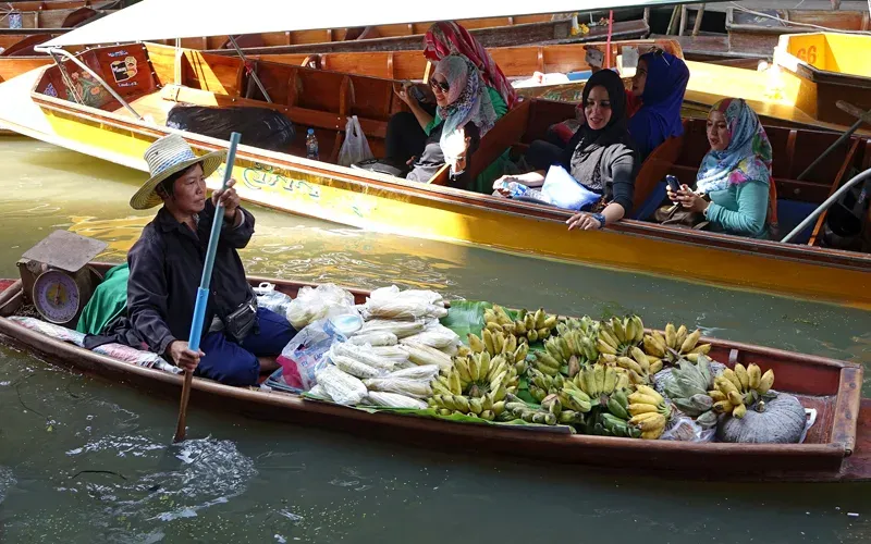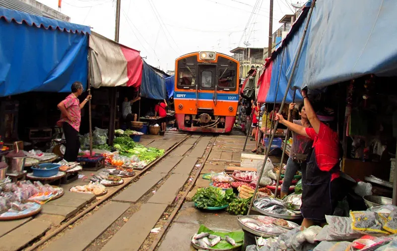 O Mercado do Trem é uma das experiências mais singulares da Tailândia, localizado na estação de Maeklong, em Samut Songkhram, a cerca de 70 quilômetros de Bangkok. Este mercado tradicional opera ao longo dos trilhos da ferrovia, onde comerciantes vendem frutas, verduras, legumes, frutos do mar e outros produtos diretamente sobre os trilhos.